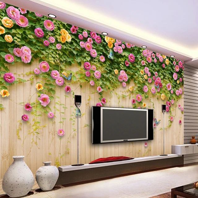18. Custom Mural Wallpaper Green Vine Butterfly Rose Flower Wood Board